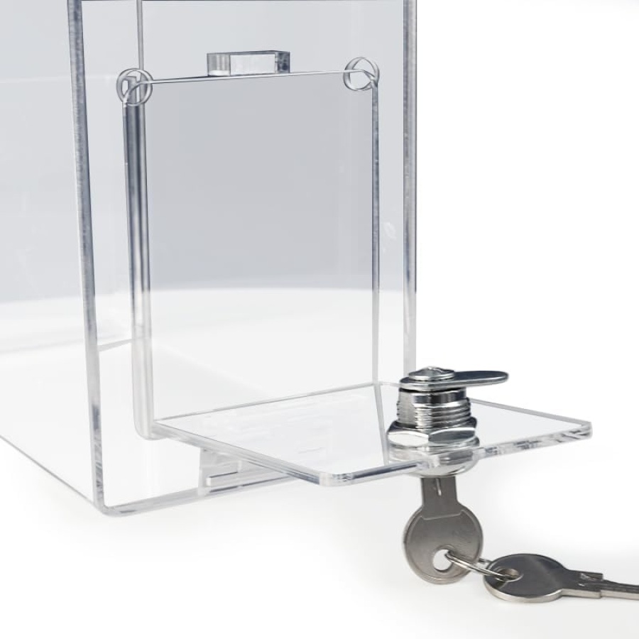 - Con un compartimiento adecuado para poner hojas y/o bolígrados, y puedan escribir sugerencias y comentarios en su empresa, tienda, o lugar de conveniencia.