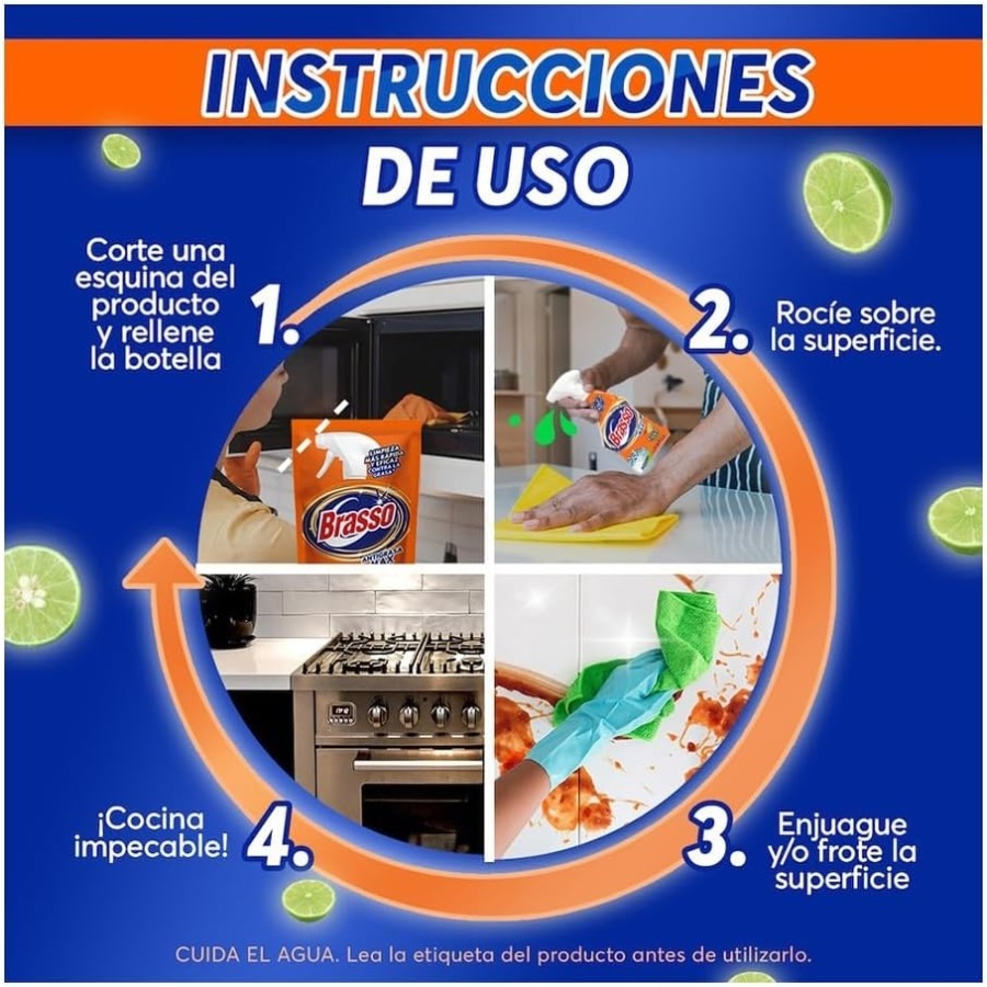 Brasso Gold Cocina Limón contiene una espuma activa que deja totalmente limpia la superficie donde se aplique.