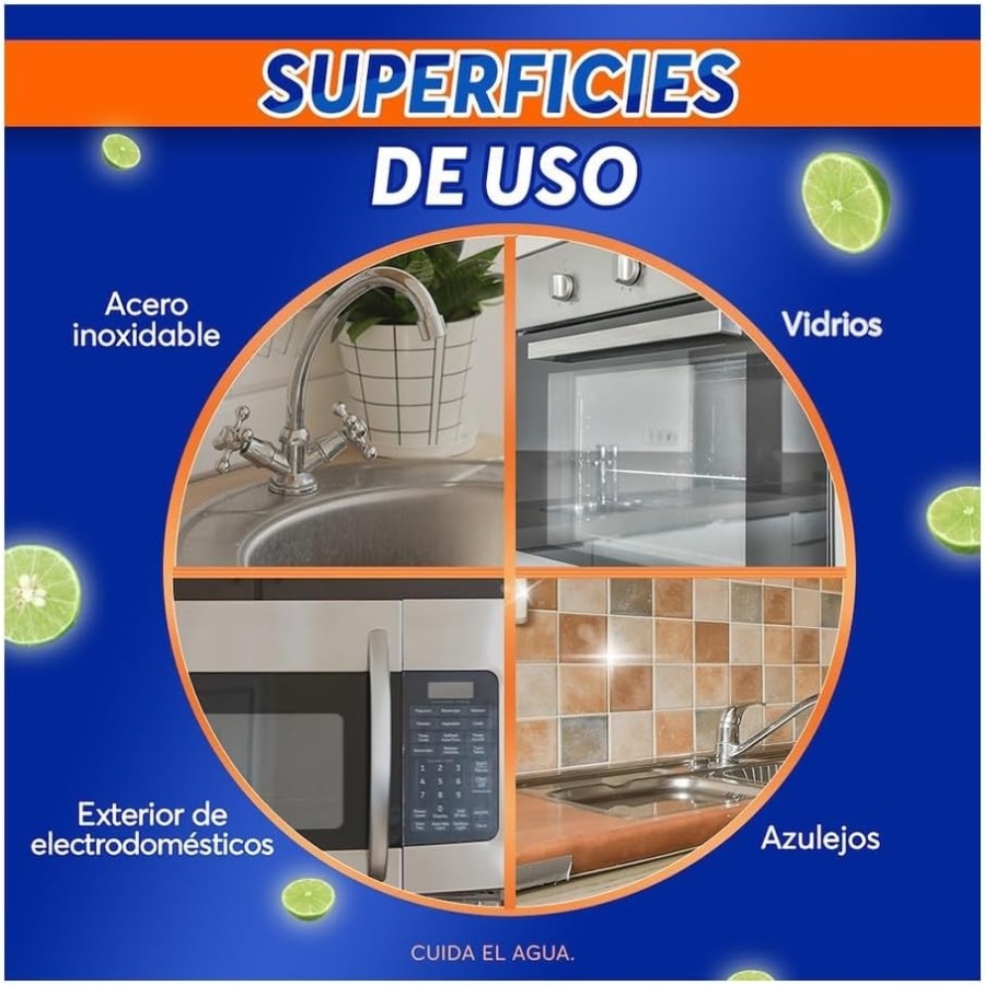 - Ideal para superficies: acero inoxidable, vidrio, esmaltadas, plástico, azulejos y exterior de aparatos electrodomésticos.