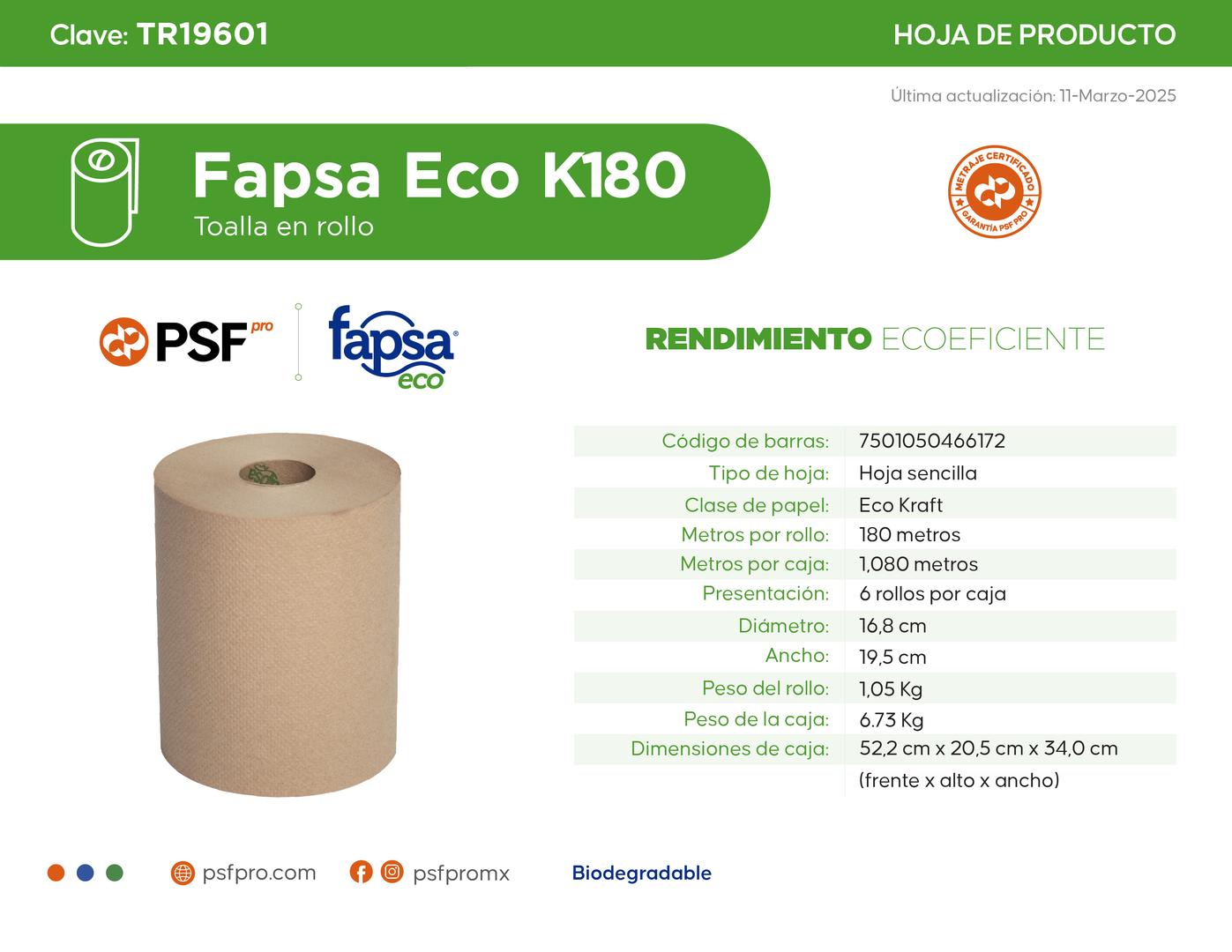 La Toalla en Rollo marca Fapsa® Eco ofrece un producto que brinda al usuario un excelente rendimiento y suavidad en cada hoja, papel hecho con fibras 100% recicladas, resistentes y altamente absorbentes, lo que permite un secado de manos eficiente. Ideal también para tareas de limpieza y usos múltiples.